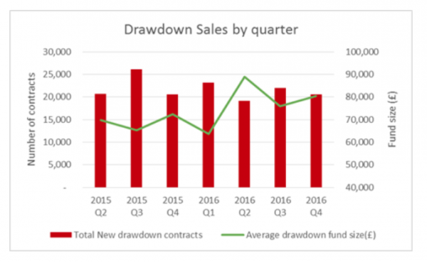 ABI data shows drawdown contracts entered into fell back slightly, from 23,000 to just over 20,000 between Q3 and Q4 of last year. The proportion of customers switching provider to buy either an annuity or drawdown product was at 50 per cent for Q3 2016.