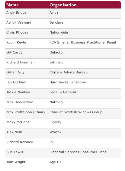 The panel includes representatives from life insurers, banks, plaforms, asset managers and consumer and small business groups. The panel includes providers of digital advice and guidance propositions such as LV and Nutmeg, and network Intrinsic, but Hargreaves Lansdown is the only large organisation with a mainstream financial advisory arm on the panel. robin Keyte, of Keyte Financial Planning, who oils also on the FCAs small business panel is the only purely advice based traditional firm on the panel. Gill Cardy has formerly practised as a financial adviser.