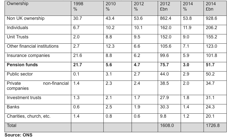 The ONS report reveals that in 1963, the proportion of shares held by pension funds was 6 per cent, growing to a high of 32 per cent in 1992. Since then pensions funds’ holdings have fallen.
