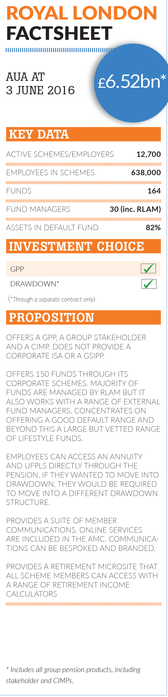 Royal London focuses on small to mid-tier employers. Combined with the fact that it has no GSipp or corporate Isa, this means corporate advisers are the main route to market. The provider requires average employee contributions of £1,500 annually and will not consider employers phasing up from 1 per cent minimum contributions.